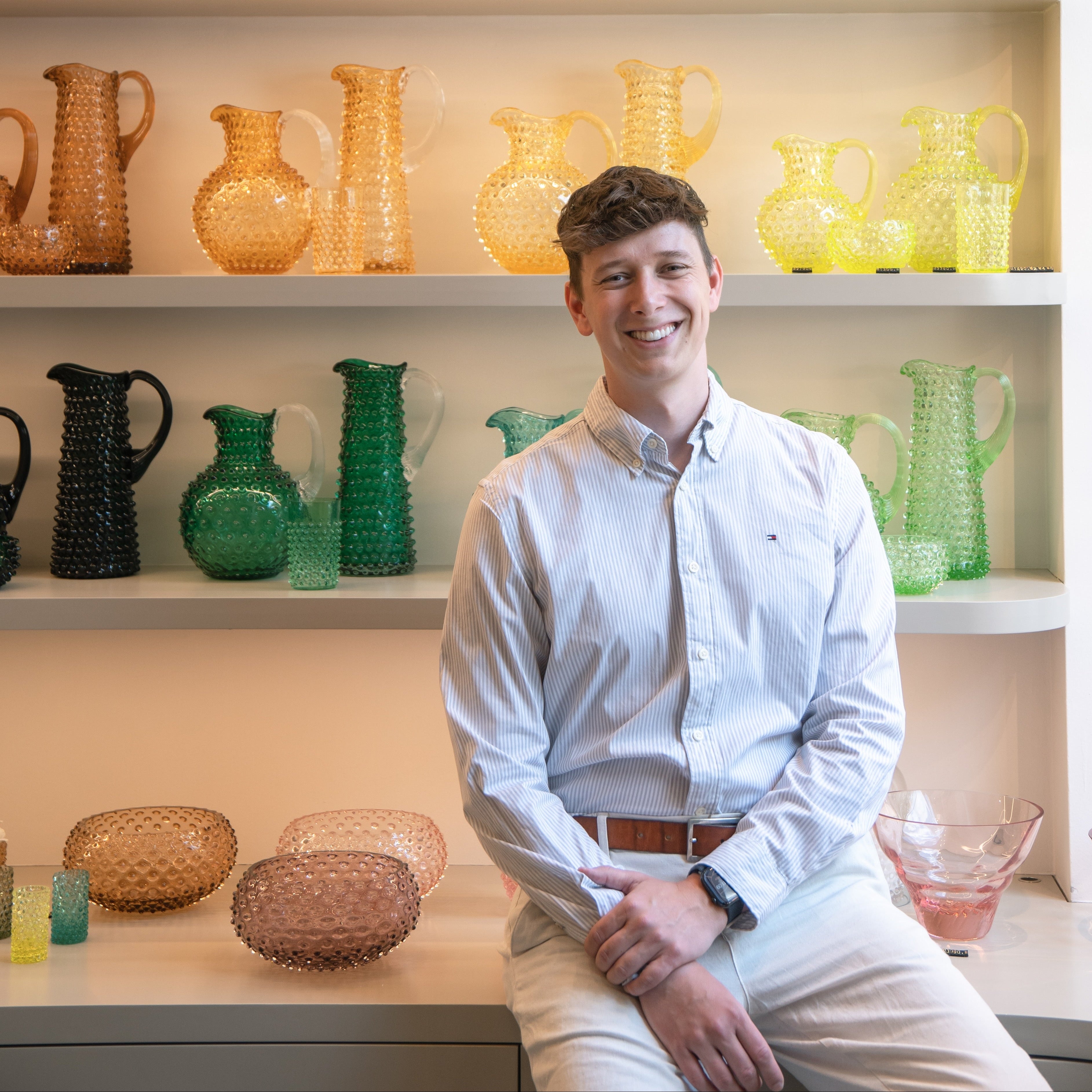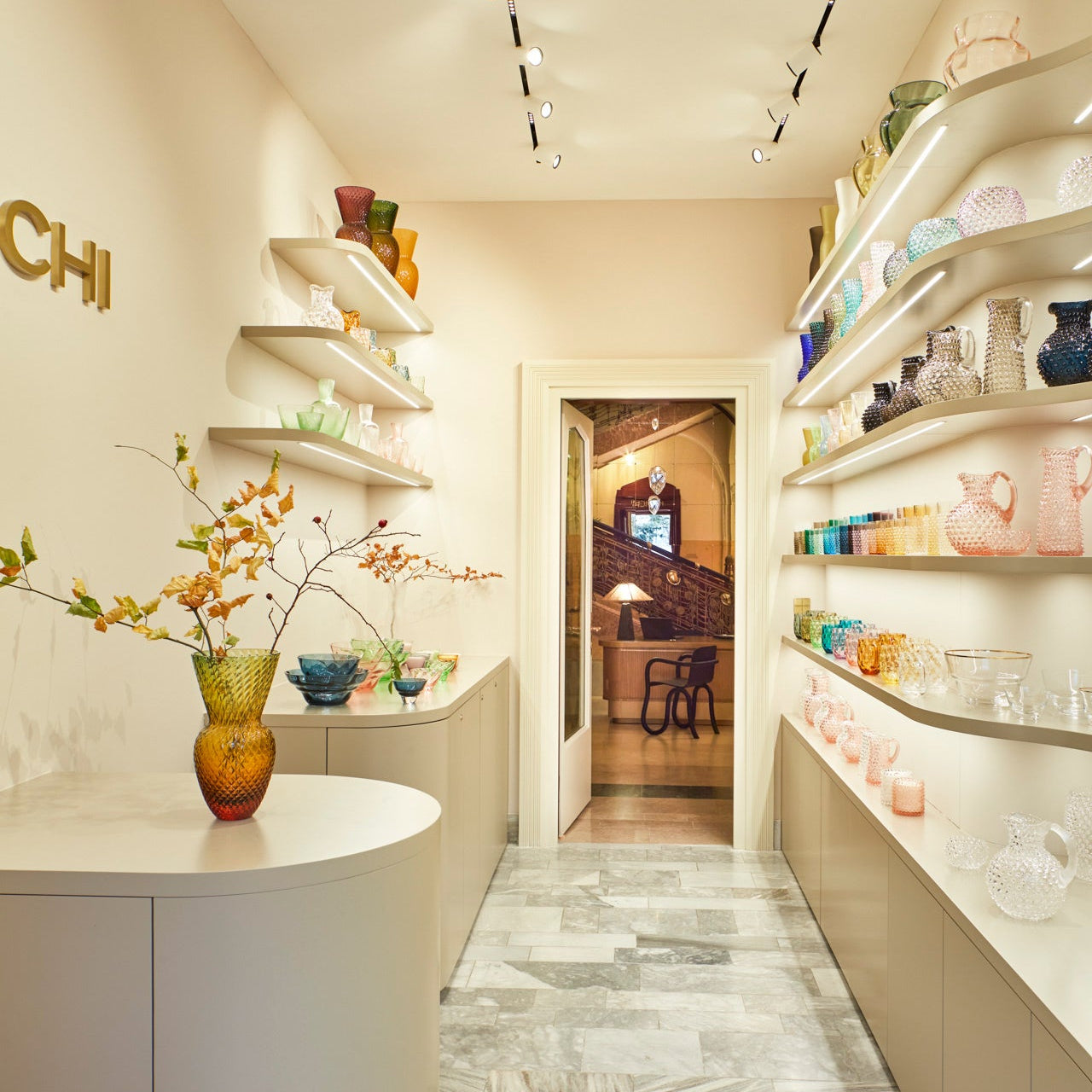 The boutique interior was designed for KLIMCHI by architect Sarah Myslíková in collaboration with glass designer František Jungvirt. Together, they created an airy and dynamic space with a seamless transition from the storefront display into the interior. Golden accents and fresh flowers enhance the refined character of the boutique.